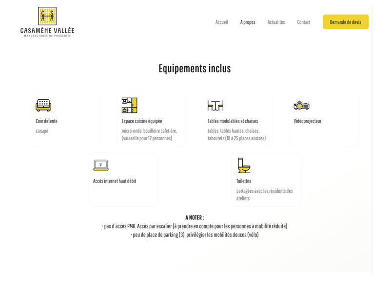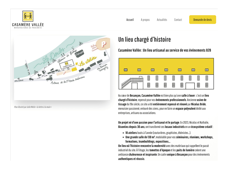 Conception graphique et réalisation des différentes versions du logo (avec baseline, cigle seul, illustration du bâtiment d’après plan architecte, invitation), habillage graphique du site web.